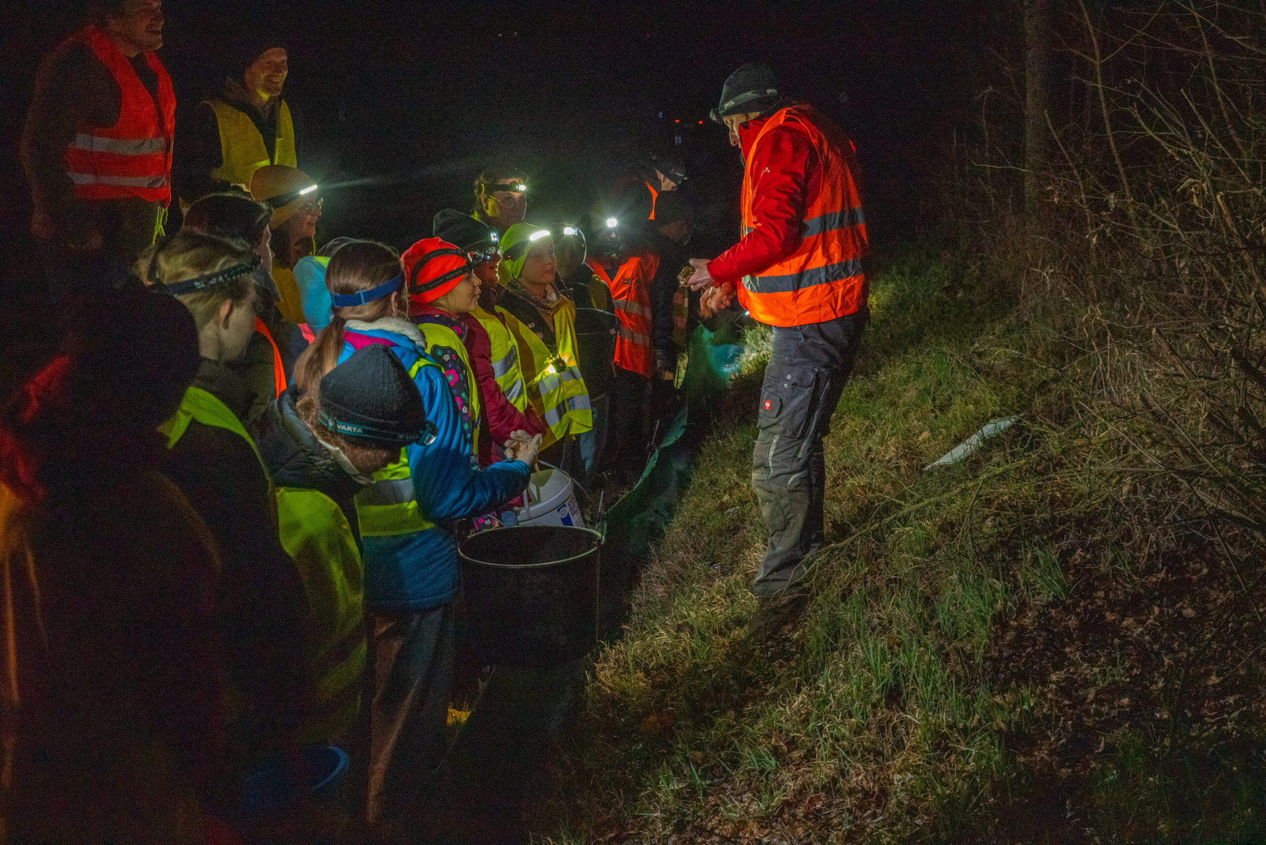 Zu zwei Abendterminen trafen sich viele interessierte Schülerinnen und Schüler der 6. Jahrgangsstufe und einige Eltern am Laichgewässer zwischen Herbstadt und Breitensee mit ihren Biologie-Lehrkräften Silvia Jetschni und Johannes Hey. Ausgerüstet mit Stirnlampen, Warnwesten und Eimern sammelten die fleißigen Helferinnen und Helfer beim Ablaufen des 500 Meter langen Zaunes, der am 05. März von den Aktiven des BUND Naturschutz (Ortsgruppe Bad Königshofen) aufgestellt worden war, an beiden Tagen über 550 Erdkröten, die anschließend im Laichgewässer ausgesetzt wurden. Ein besonderes Highlight war ein einziger Molch, der am Zaun gesichtet wurde und anhand des orangefarbenen Bauchs und der schiefergrauen Oberseite von den Kindern schnell als Bergmolch identifiziert werden konnte.