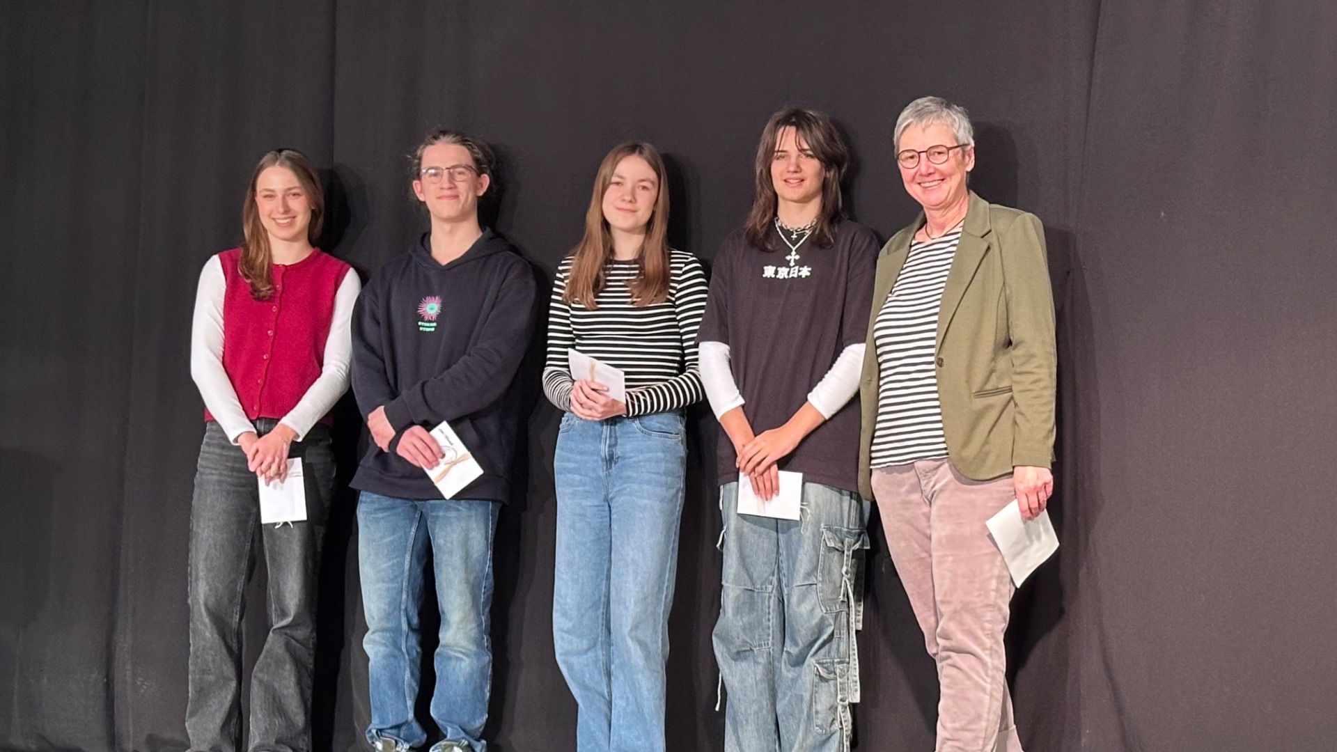 Bei der feierlichen Preisverleihung wurden die besten Entwürfe ausgezeichnet: Der erste Preis gewann Fiola Kriebel (8b), den zweiten Preis teilen sich Felix Warmuth und Monika Sell (13. Jahrgangsstufe) und der dritte Preis ging an Emma Schütze (9b).